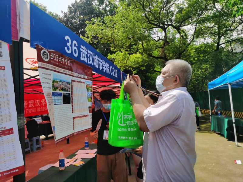 “我的成绩高出本科分数线5分,特别喜欢武汉城市学院,第一志愿报你们学校,录取的概率大不大?” 在招生宣传现场有一个考历史的考生询问招生老师,一边询问一边记录相关信息。