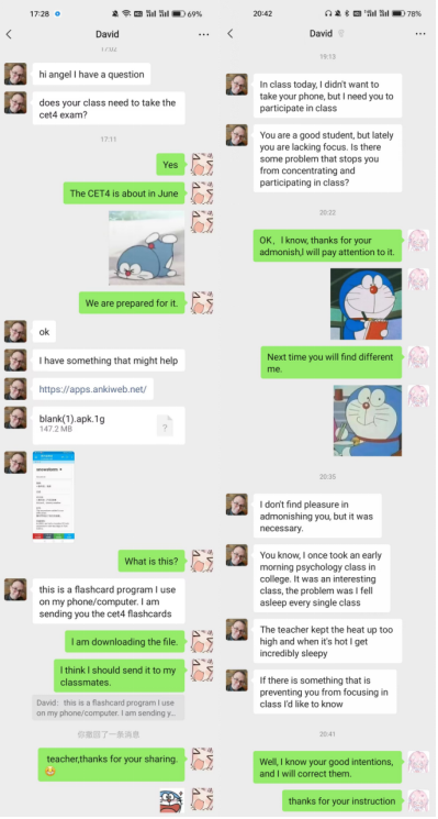David在课外和学生像朋友一样相处,在和学生聊天时,会跟学生讲他们国家的文化,还会教学生地道的英语表达方式。David也会学习中国一些有趣的文化。某次David和Angel聊天时,看到David每次说话时都只有词语,不会使用表情包,Angel主动提出教David表情包,David欣然接受,还保存学生们使用的有趣表情包,在后面的聊天中David也经常使用他保存的学生使用的表情包。