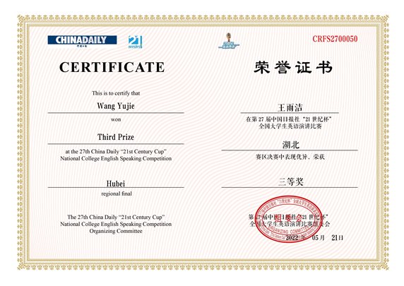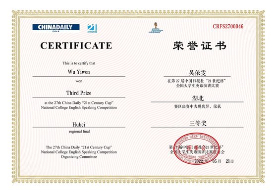 (记者:李娜)2022年5月21日,武汉城市学院外语学部王雨洁,吴依雯两名选手,在学校学部领导的高度重视和支持下,在学部徐希,廖钰惠,胡乔三位指导老师的精心指导下,在第27届中国日报社“21世纪杯”全国英语演讲比赛中展现出独属于自己的风采,获得湖北省三等奖的好成绩。