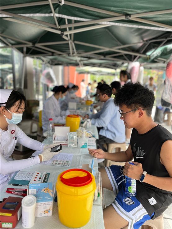作为医护人员,他们时刻牢记医者使命,深知每一滴鲜血对患者的珍贵。医护人员顶着烈日在给同学们进行身体健康筛查,查看是否达到健康血液的指标,只有健康的血液才能捐献出去。当所有体检项目完成后,便可以上车献血了。同时,医护人员在献血结束后也会再三叮嘱同学们好好休息,他们以实际行动彰显了服务他人的志愿精神,也体现医护人员的专业素养和职业责任感。