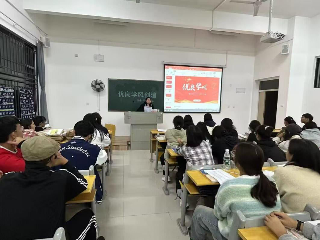 为了增强良好学风发展,加强人才培养,明确学习目的,矫正学习态度,使学校真正成为建设社会主义精神文明的重要阵地,促进学生逐步树立科学的世界观,武汉城市学院外语学部23级全体同学于 2023年10月26日,在红安校区5号教学楼J120参加了有关“创建优良学风”主题班会,本次班会由学部组织,由导员曾希总结讲话。