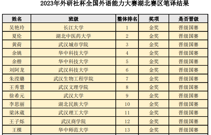 在此次举办的笔译赛项中,两位同学与来自全省包括武大、华科等知名高校的126位同学同台竞技,她们顶住压力,以良好的心态和备赛时积累的翻译实力取得了优异成绩。特别是黄荷同学,更是以第三名的佳绩获得了湖北省金奖,并将与另外12位同学一起代表湖北省参加国赛。这是自国才杯举办以来,我校首次有学生闯入国赛,笔译赛项今年也是第一次增加的比赛项目,两位同学都表现出色,取得了开门红,也体现出我校外语专业学生卓越的专业能力!期待黄荷同学在国赛中再创佳绩!