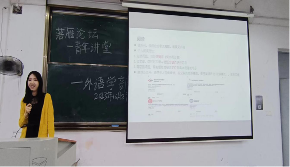 (通讯员 李怡欣)10月29日晚17:30,外语学部开展落雁论坛·青年讲堂,本次讲座邀请到外语学部2023年国家奖学金获得者21级英语专业刘思涵同学分享了自己的学习心得和方法,令在场22级全体同学受益匪浅。