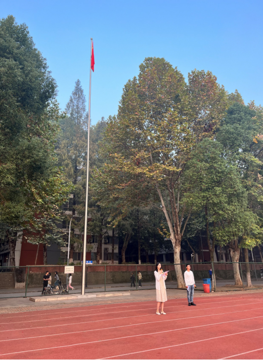 (新闻网讯 刘佳慧、朱梦园)为加强学部集体荣誉感,激发学生学习热情,提升自我,激励师生以崭新的面貌迎接新的工作和学习。10月30日早6:50,武汉城市学院外语学部在旗杆前举行隆重庄严的升旗仪式,学部分团委书记闫艺老师、学部辅导员李巡老师、梁鸽老师、高轩英老师以及外语学部全体学生出席了本次升旗。