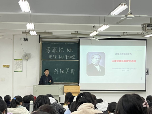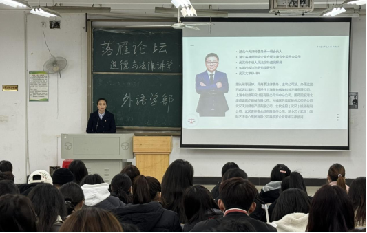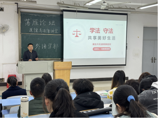 2023年11月13日下午5点,在南6101,外语学部开展了落雁论坛·道德法律讲堂。本次讲座外语学部邀请到湖北今天律师事务所一级合伙人、武汉市中级人民法院特邀调解员刘艳军律师为外语学部青年学子们带来一场道德与法律讲座。