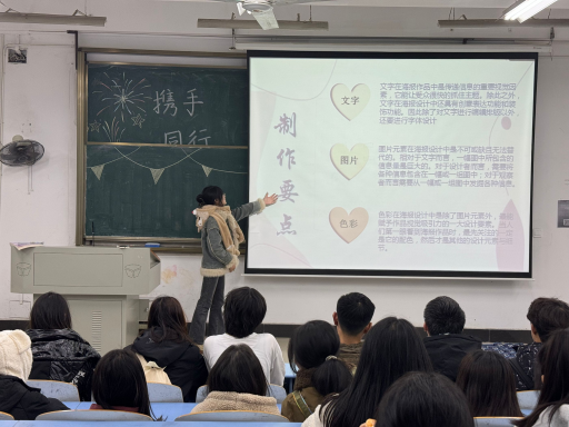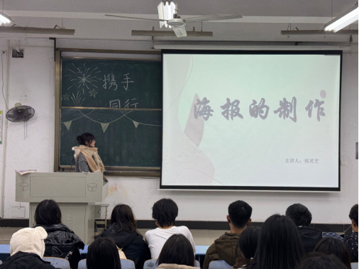 首先科创部部长郑灵芝,给大家介绍了制作海报可以使用的软件工具如ps等,接着她详细讲解了制作一份海报,应该包含的内容要有活动主题,活动开展时间,地点,参赛方式,参与人员等详细内容,她说:“一份好的海报不仅能够吸引人们的注意力,更能准确地传达我们想要表达的信息。”最后,她希望所有成员能通过这次培训能够掌握海报设计的基本技巧,提高科创部的工作效率和宣传质量,为即将到来的活动做出更出色的贡献。