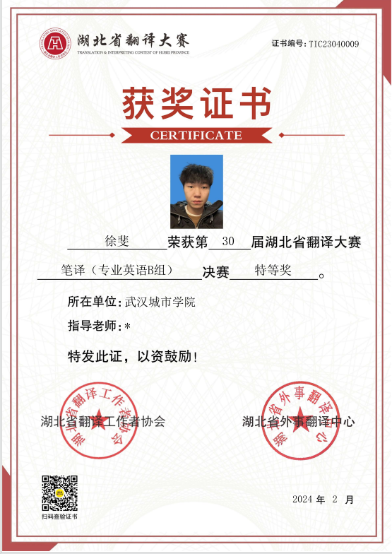 近日第30届湖北省翻译大赛圆满落幕,我院外语学部22级英语4班的徐斐同学以优异的成绩获得了特等奖。