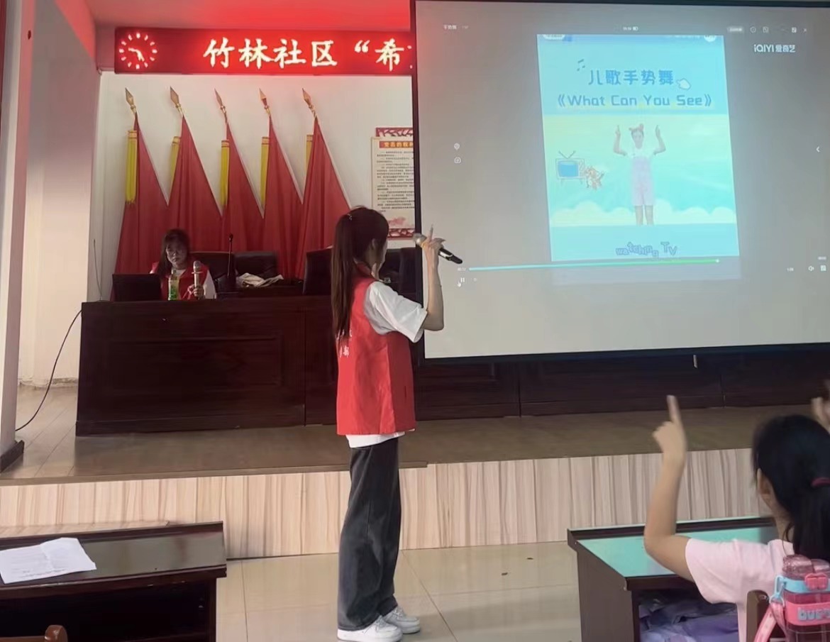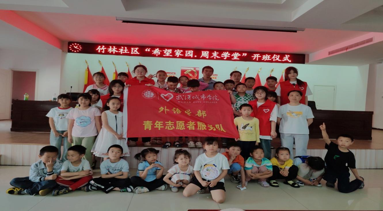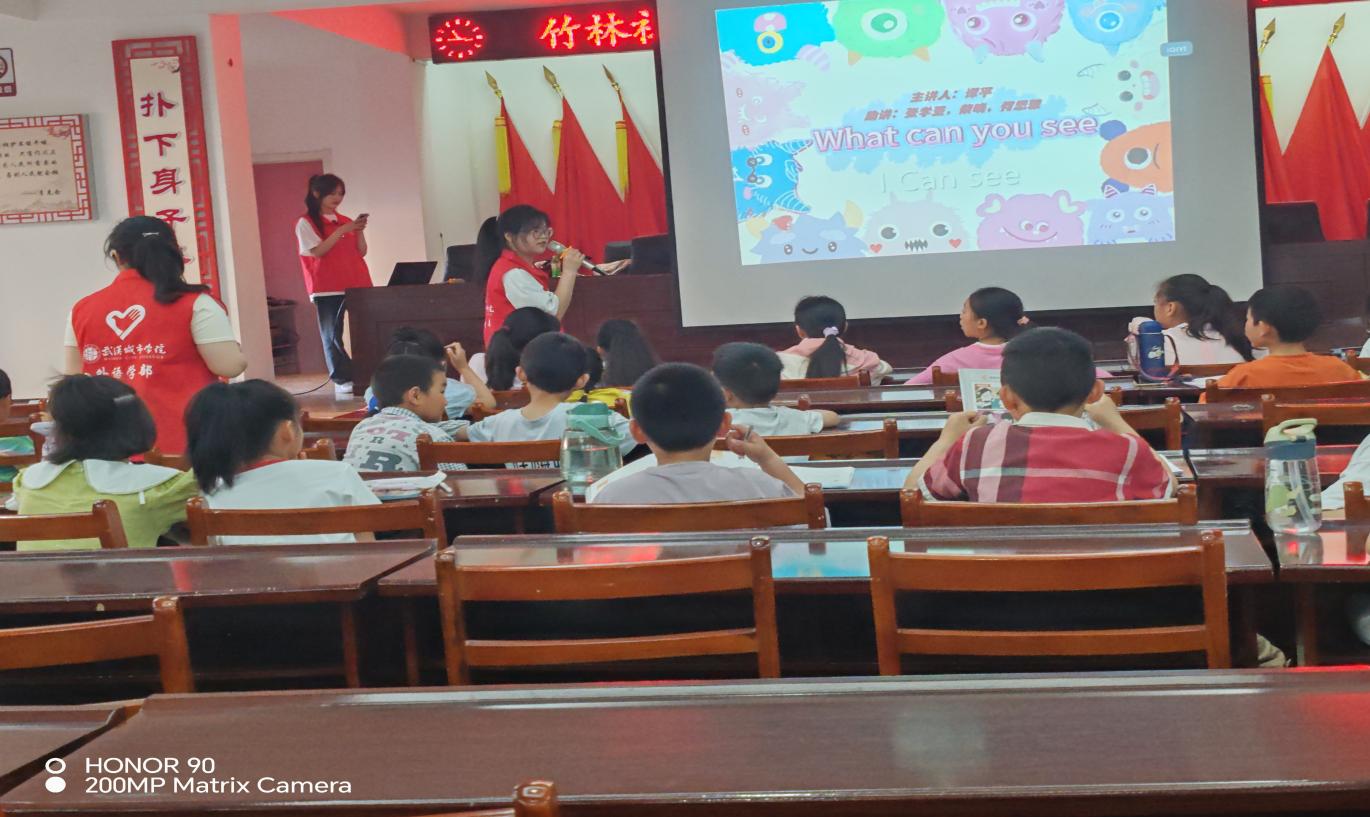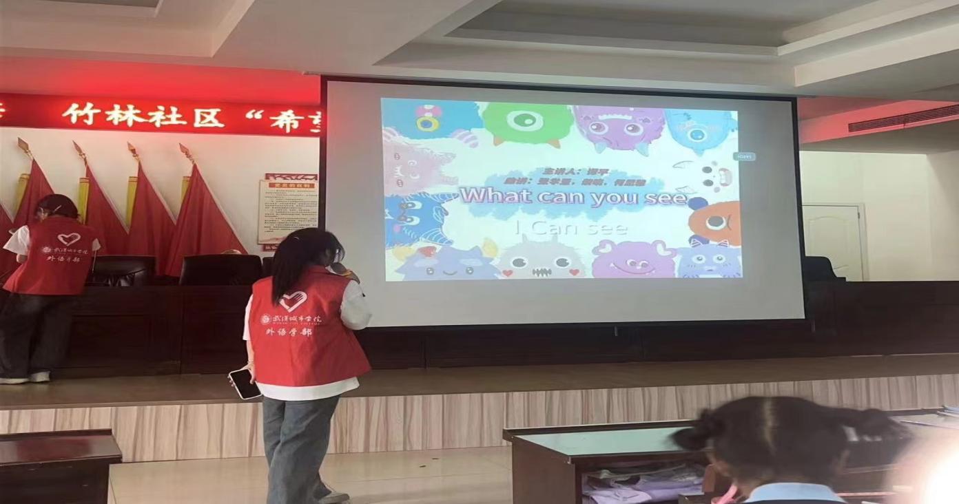 2024年5月18日武汉城市学院红安校区外语学部大一学生谭平、何思雅、柴晓、张学亚四位大学生志愿者来到红安县城关镇竹林社区,为社区40余位小朋友开展爱心课堂活动。活动开始前,志愿者老师们就准备了丰富的课堂内容,本次爱心课堂讲的是《英语趣味绘本》等趣味课程,让小朋友们在玩乐中学习,在学习中成长。
