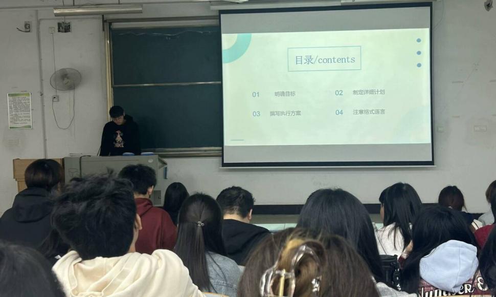 首先,23级商英一班黄浪同学以幽默风趣的语言、丰富的案例,深入浅出地讲解了策划书的写作技巧和方法。他强调,一份优秀的策划书需要具备清晰的逻辑结构、明确的目标定位以及创新的思维模式,详细介绍了策划案的基本框架、撰写技巧和评审标准,让大家对策划案的制作有了更深入的了解。