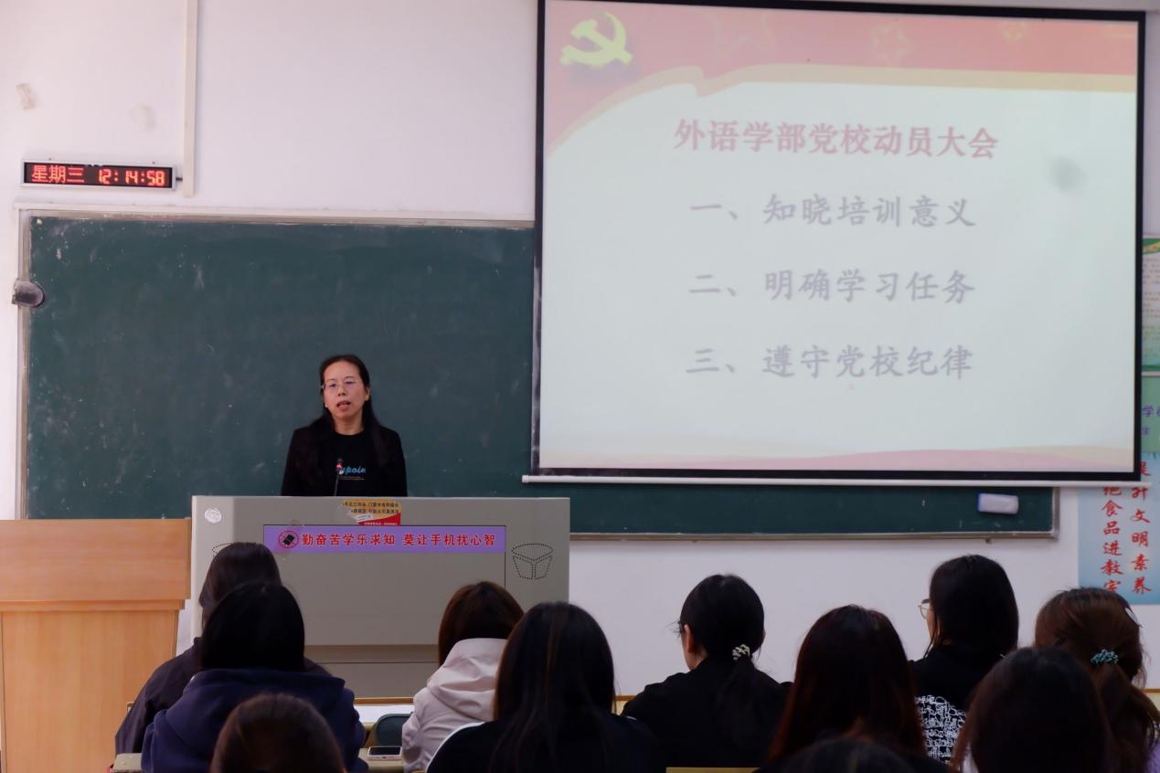 会议开始,外语学部党总支秘书程桂花老师发表了重要讲话,她介绍了此次动员大会的背景和目的,从知晓培训意义、明确学习任务以及遵守党校纪律三点展开了讲话。她不仅强调了党校培训在党员培养中的重要作用,还强调了学习纪律和学风建设的重要性,要求学员们要严格遵守培训纪律,保持良好的学风,确保培训取得实效。