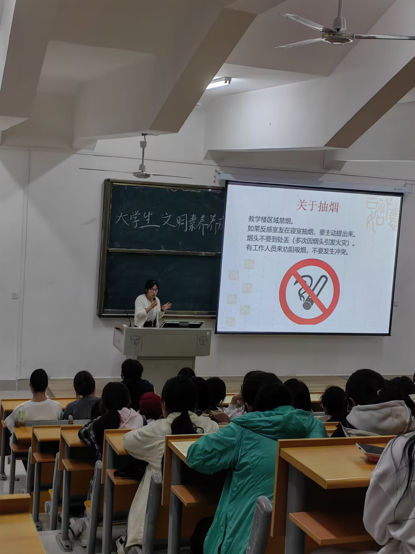 班会上,周雅乔老师围绕大学生日常生活中的关键文明行为进行了深入浅出的讲解。她首先强调了教学区禁烟的重要性,指出吸烟不仅危害个人健康,还会影响周围同学的学习和生活环境。周老师通过生动的案例和数据,让同学们深刻认识到禁烟的必要性和紧迫性,并呼吁大家自觉遵守学校规定,共同维护无烟校园。