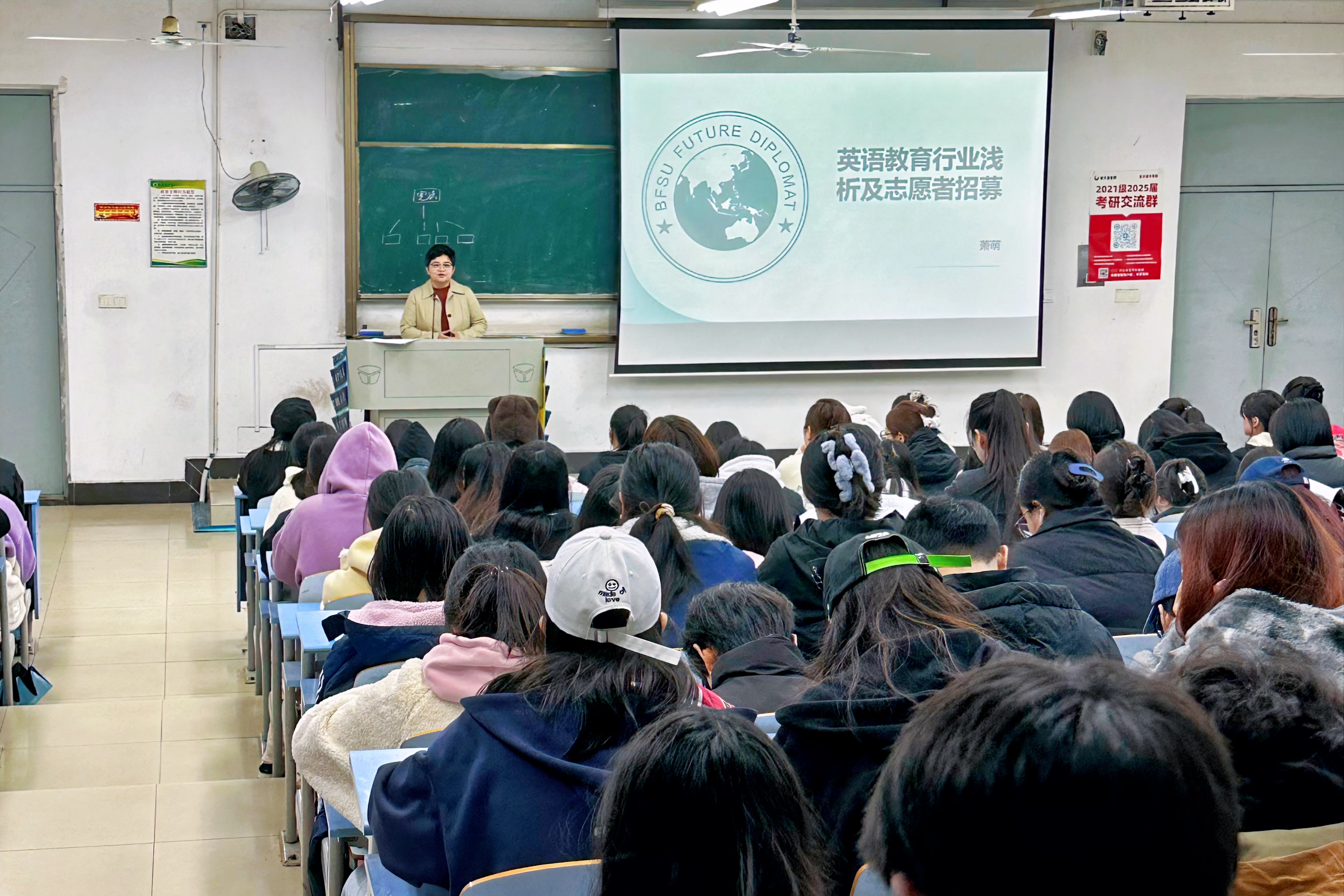 讲座期间,肖萌老师深入地分享了自己的创业历程,把创业过程中的曲折经历、关键抉择以及所获经验一一讲述。她用鲜活的故事告诉同学们,英语教育之路虽布满荆棘,但只要心怀信念、勇于创新、坚持不懈,就能开辟出属于自己的一片天地。同时,她还着重强调,同学们在校园中就要积极主动地去尝试多元事物,锻炼自身综合能力,逐步培养就业竞争力,为未来的职业发展筑牢根基。随后,肖萌老师现场发布英语教师招聘公告。