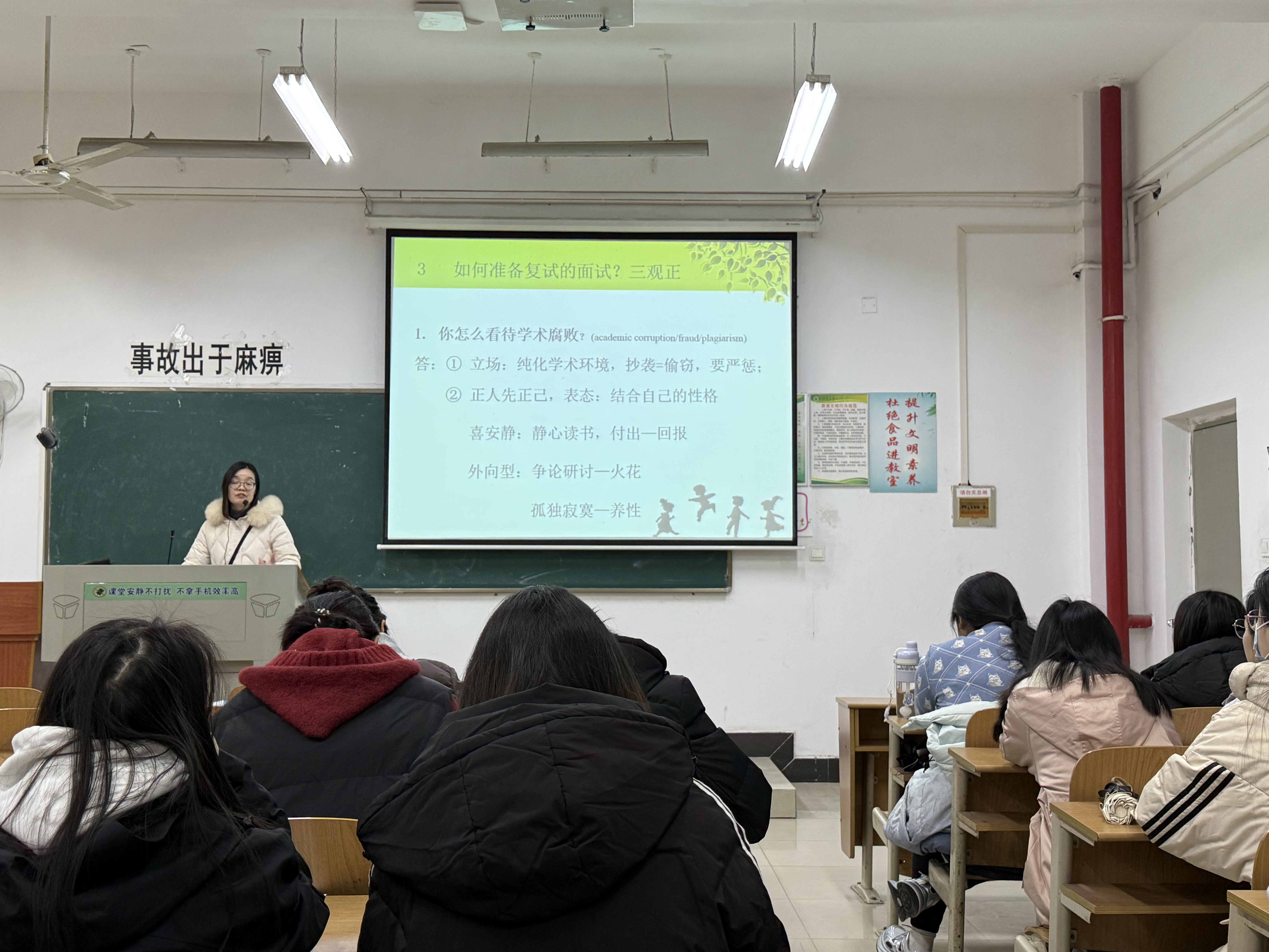 为帮助2025届考研学生更好地准备复试,武汉城市学院外语学部近日特邀鲍春燕老师为学生们进行了一场详尽的考研复试指导讲座。讲座内容涵盖了复试信息获取、笔试准备以及面试技巧等多个方面,为即将参加复试的学子们提供了宝贵的建议和实用的策略。