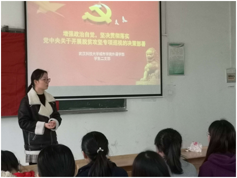2018年11月2日、11月5日、11月6日,外语学部教工一支部、教工二支部、学生一支部、学生二支部先后召开了支部主题党日,外语学部理论中心组开展了学习活动,全体党员认真学习讨论《湖北省扶贫攻坚小组关于打赢扶贫攻坚战三年行动的实施意见》。通过学习大家受益良多。党员程桂花说:“通过学习,对我省脱贫攻坚工作有了更多的了解。从文件中可以看出党和政府高度关心百姓生活疾苦,对不同原因致贫的百姓采取不同的帮扶办法,时序目标明确,充分体现了党和政府脱贫攻坚的决心。” 党员罗禄说:“脱贫可以用两个‘xin’来实现自己的梦想,第一个‘xin’是用‘心’,我们要让贫困的人树立自己的信心,早日脱贫。第二个‘xin’是创‘新’,脱贫也需要结合高科技手段,用新的方法来帮助大家脱贫。”党员陈婵说:“清醒认识把握打赢脱贫攻坚面临任务的艰巨性,认清在实践中存在的突出问题的紧迫性,不放松,不停顿,不懈怠。提高脱贫质量,扎扎实实把脱贫攻坚推向前进。作为辅导员老师,关心贫困学生的生活和学习,尽力为他们解决实际问题,做好力所能及的事。”党员胡清华说:“通过本次支部主题党日,我明白了脱贫攻坚的重要性,它既是重大的民生问题,也是重大的政治责任。作为学生党员,可以参加一些志愿活动,参与政策宣传,比如教育扶贫、医疗扶贫、产业扶贫、到户增收等政策宣传到户。”学员方华宁说:“我相信通过党中央的正确引导和支持,通过各级扶贫帮扶干部的悉心指导,贫困群众的不懈努力,我们一定能打赢这场扶贫攻坚战,到2020年一定能够实现全面小康社会!”