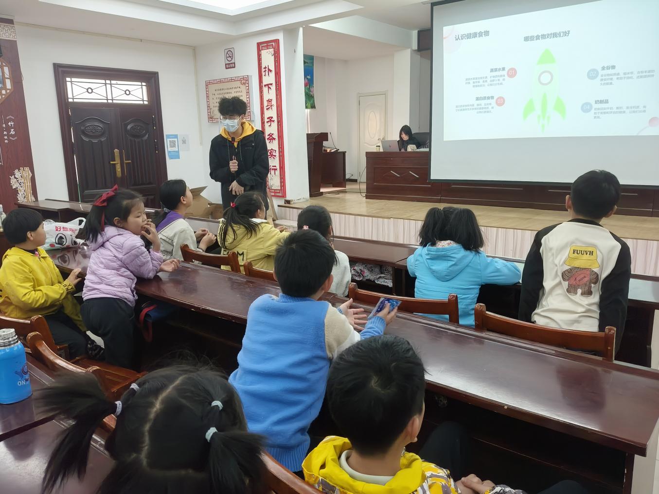 第二课:周向晴解锁“简单生活小常识”第二节课由周向晴主讲,她以“简单生活小常识”为主线,通过情景剧表演和实验演示,将健康习惯融入生活场景。助教团队用pH试纸对比清水与碳酸饮料浸泡蔬菜叶的变化,直观揭示“少喝饮料多喝水”的科学依据;通过“冰箱收纳大作战”竞答游戏,教会孩子们合理分类储存蔬菜以延长保鲜期。周向晴还结合外语学部特色,教孩子们用日语、英语说出“多吃蔬菜”等短句,并带领全场齐跳自编的“洗手健康操”,将课堂气氛推向高潮。“回家我要教妈妈用淘米水浇花,还要用英文提醒爸爸少吃油炸食品!”一名参与活动的孩子认真“规划”着家庭健康计划。