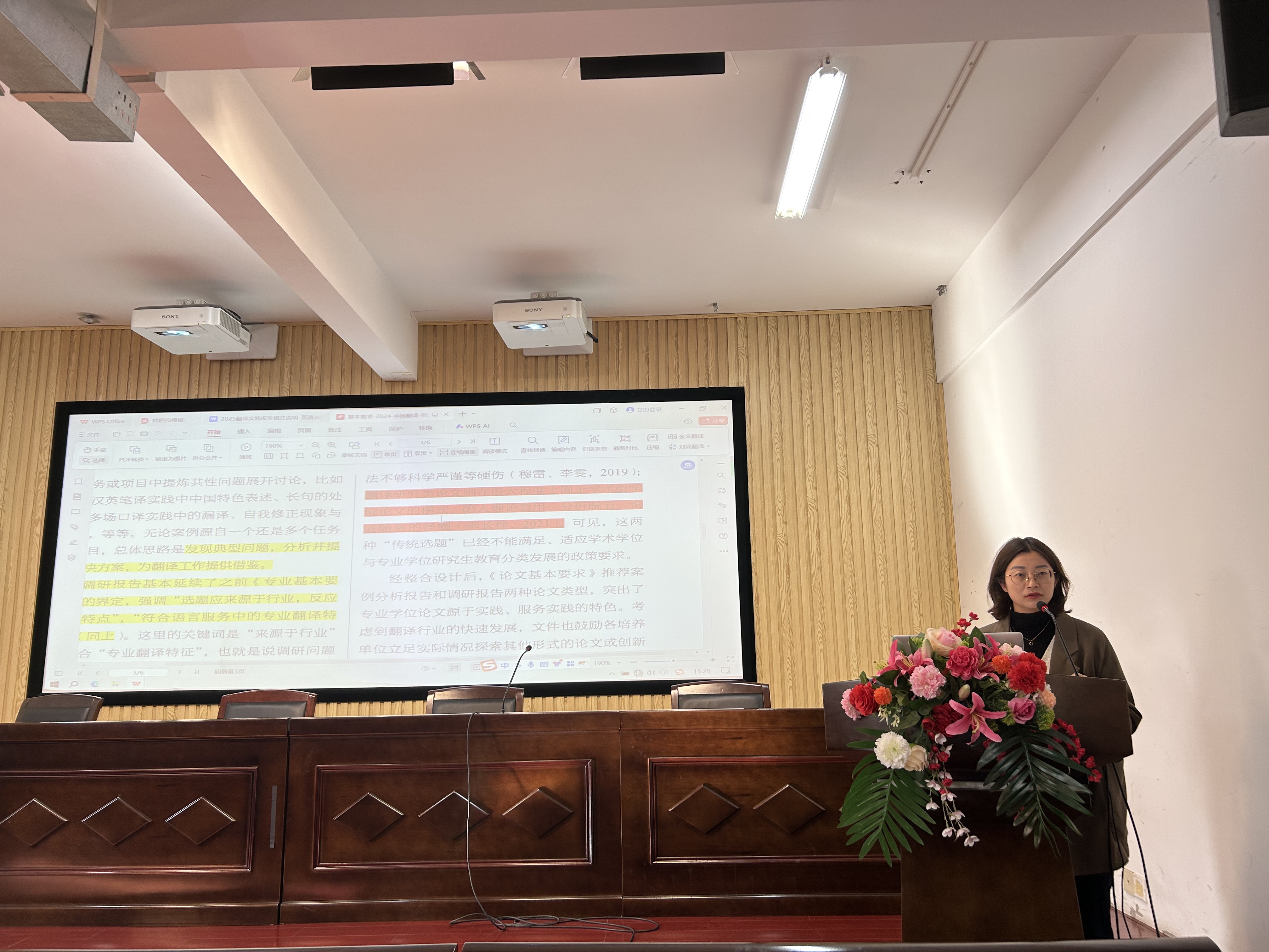 在翻译实践报告指导环节,罗璐老师作了系统而深入的专项讲解。她强调,翻译实践报告必须立足真实案例,指导学生独立完成未译文本的翻译工作,综合运用所学翻译策略、方法与技巧,避免简单套用理论。她建议指导教师引导学生聚焦词汇、句子、篇章三大层面,系统梳理翻译过程中遇到的难点及相应的解决策略。罗老师特别指出,教师要帮助学生选取具有典型性的翻译文本,并指导学生全程记录实践中遇到的困难、解决路径与个人反思,从而形成完整、真实的实践总结。她还强调,论文附录中须完整呈现原文与译文对照表格,真正做到过程可追溯、分析有依据、成果可检验。