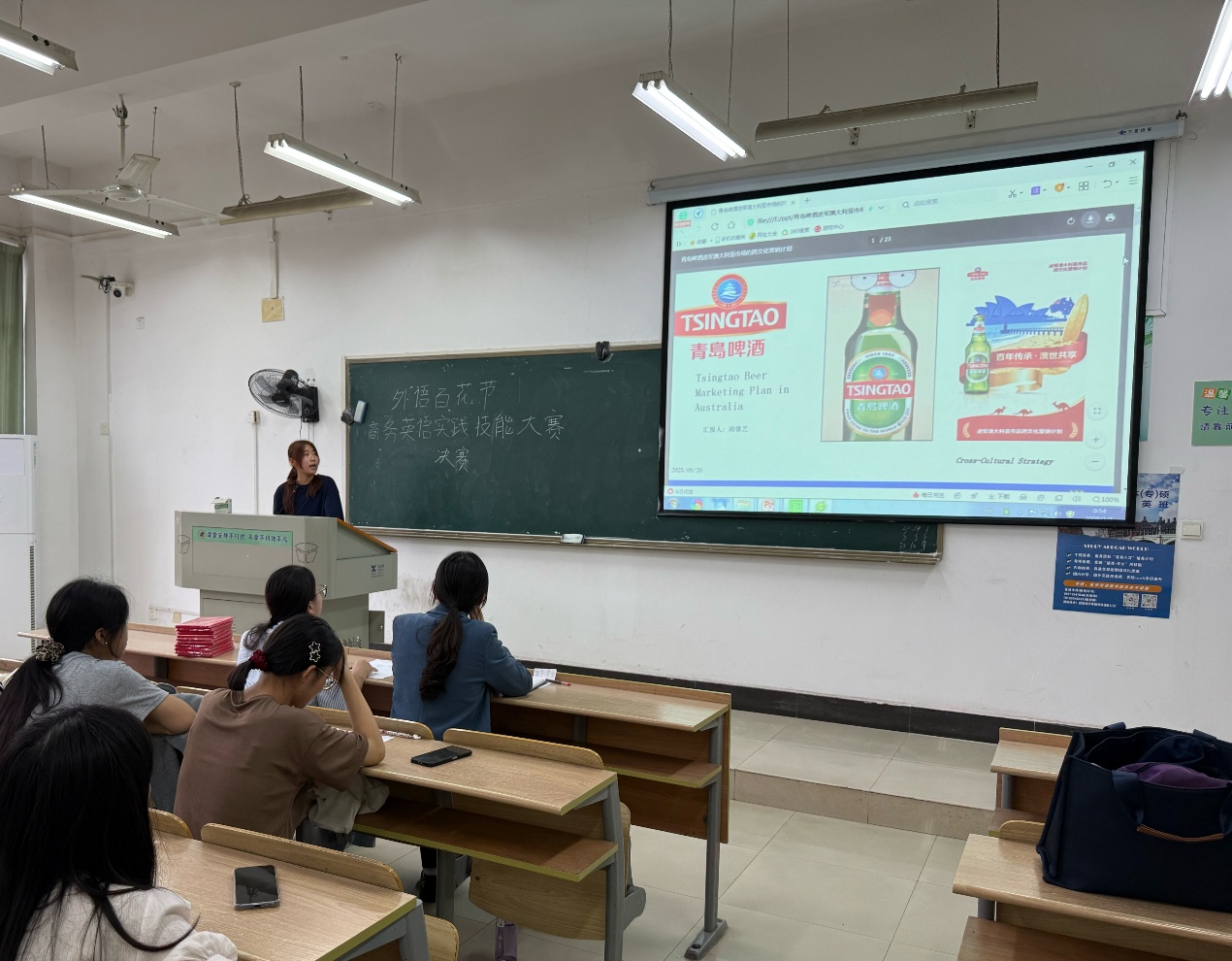 决赛当天,选手们围绕“面向海外市场的产品营销计划”主题展开角逐。参赛选手需自主选择中国企业及产品,选定与中国文化差异显著的目标市场,结合当地消费者文化特征,从产品设计、包装、定价、渠道等维度制定营销计划,并以全英文演讲形式呈现,重点突出文化差异对消费观念与行为的影响。