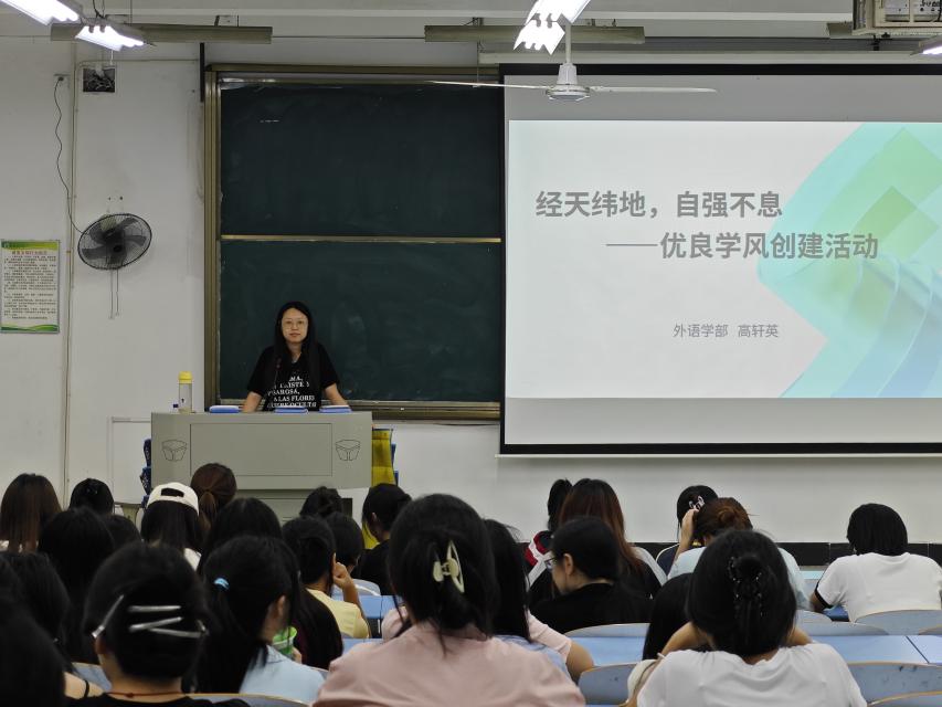 为进一步夯实育人根基,培育积极向上的学习氛围,切实解决外语学部部分学生在学习纪律与行为习惯上存在的问题,2025 年10 月26 日下午,武汉城市学院外语学部辅导员高轩英老师,在南 6201 教室面向 23 级全体学生,开展了以 “惊天纬地,自强不息” 为主题的优良学风创建专项活动,近 200 名学生到场参与。