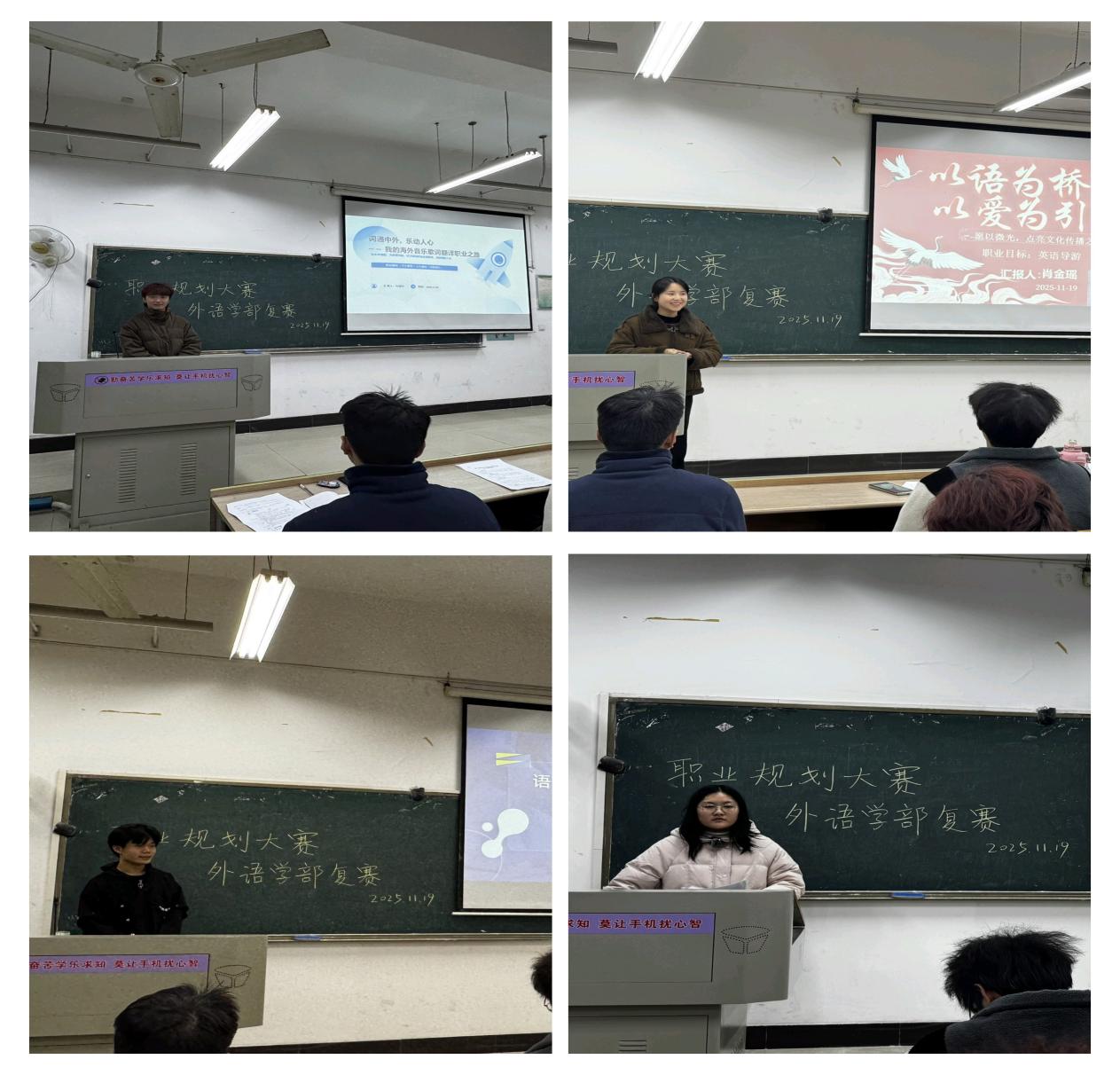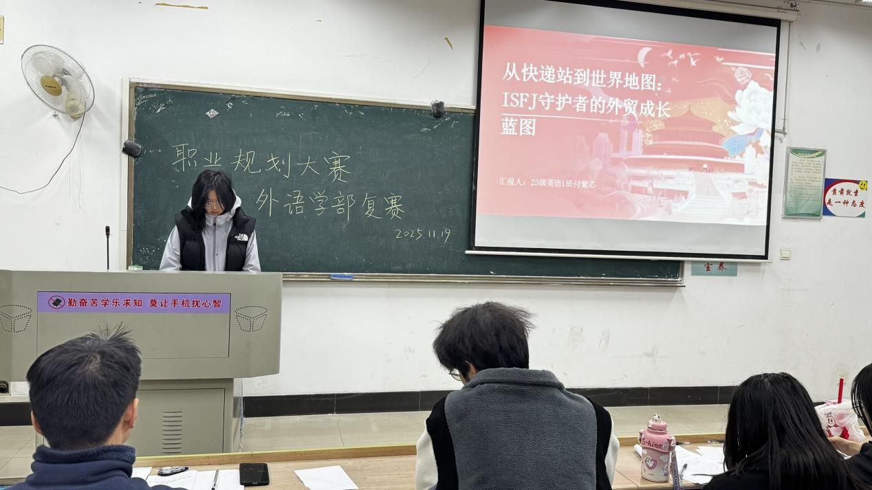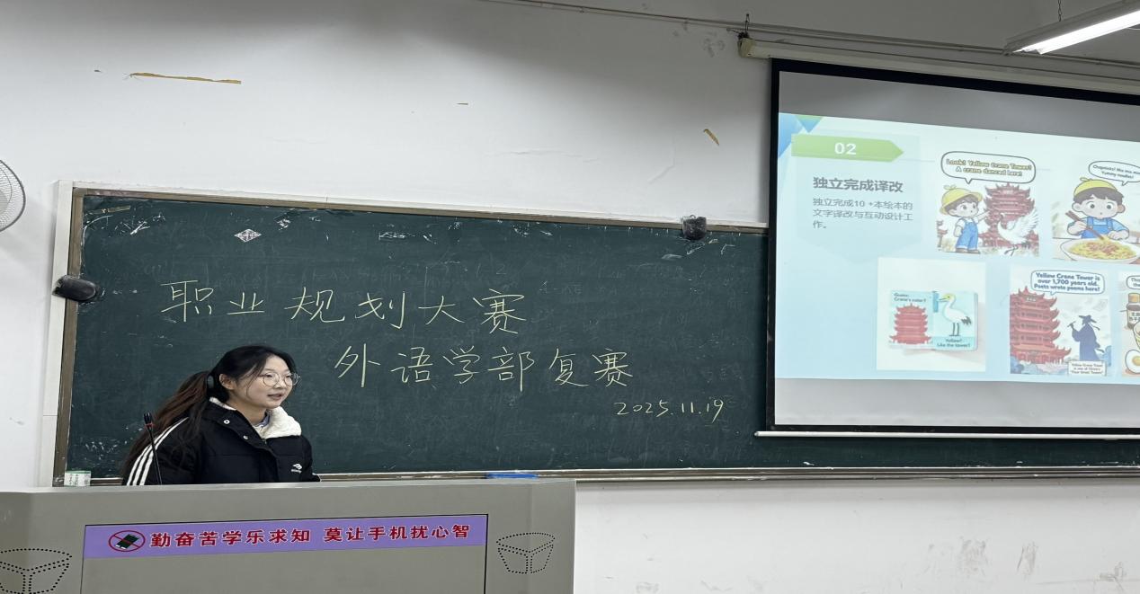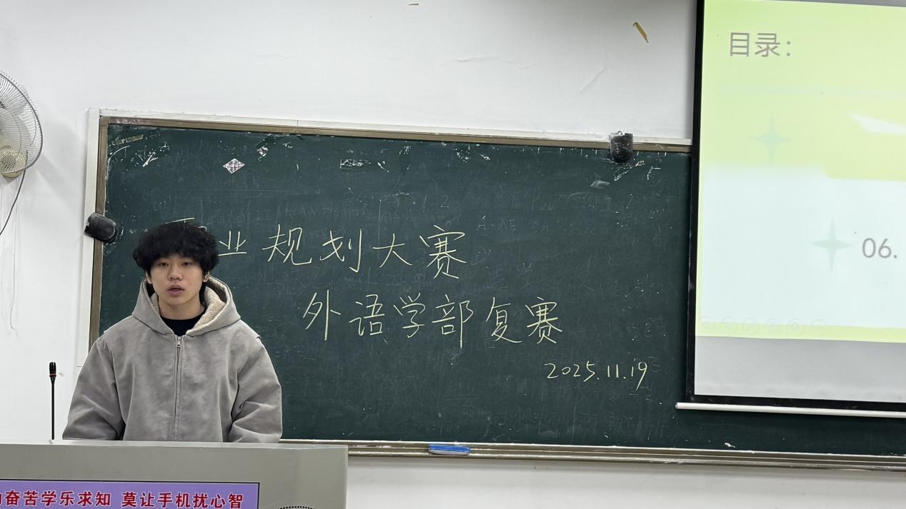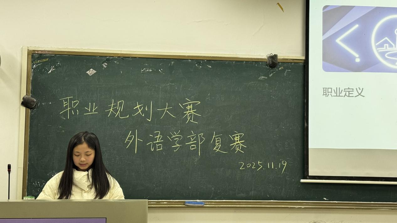 2025年11月19日,外语学部职业规划大赛复赛在南五5205教室顺利开展。此次复赛为学子搭建了梳理职业方向、展现规划能力的平台,8名晋级选手凭借清晰的目标定位与详实的实施计划,呈现了一场兼具思想性与实践性的职业蓝图盛宴。