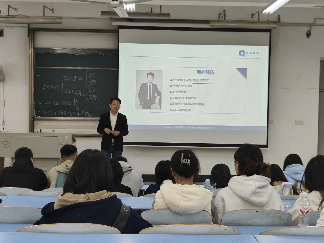 2025年10月24日下午,武汉城市学院南6102教室,外语学部“落雁论坛·学者讲堂”顺利举办,本次讲座特邀了清宜国际资深职业规划师、国家高级职业指导师陈集宏经理,作为学者讲堂主讲嘉宾,学部辅导员刘晓辉主持,为2026届毕业生搭建通往国际职场的沟通桥梁。本次讲座为同学们带来行业知识、职业生涯规划及国际就业相关内容,22级英语、商务英语毕业班同学参与了本次讲座。