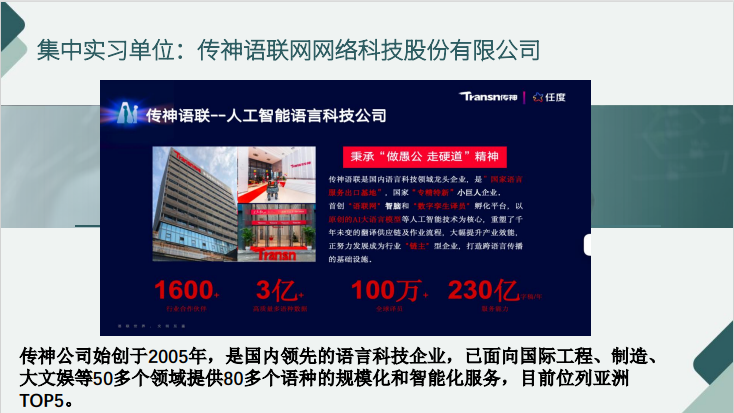 在实习安排方面,学校推荐了传神语联网网络科技股份有限公司作为集中实习单位。该公司作为语言科技领域的龙头企业,将为实习生提供系统的翻译项目实践、智能翻译培训及行业专家指导。实习周期为四周,采取“线上+线下”相结合的模式,包括线下集中实习一周与线上任务三周。学生需通过“校友邦”小程序完成每日打卡、提交周志及实习报告,并在实习结束后提交经单位盖章的《实习手册》。
