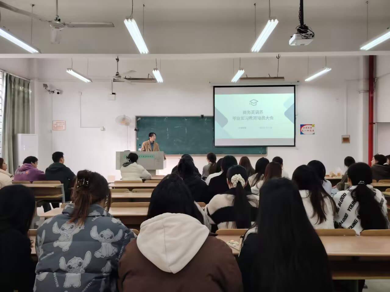 2025年11月28日,武汉城市学院外语学部商务英语系在5103教室召开2026届毕业实践环节启动会议。商务英语系主任何利敏老师出席会议并作动员讲话,全体2026届商务英语专业学生参加会议。