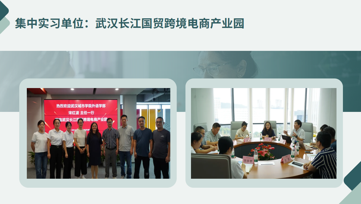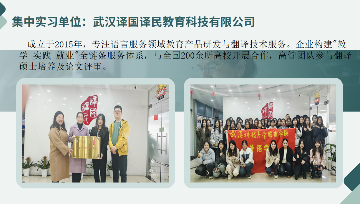 本次毕业实践环节提供多元化实习平台。学校与武汉译国译民教育科技有限公司、武汉长江国贸跨境电商产业园等优质企业建立深度合作关系,为学生提供专业对口的实习岗位。其中,译国译民公司专注于语言服务领域,构建了完善的教学实践体系;长江国贸跨境电商产业园则汇聚产业资源,打造综合性服务平台。各实习单位均配备经验丰富的企业导师,确保实习质量。