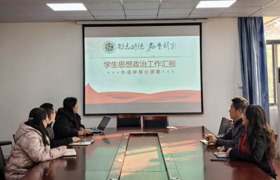 为总结外语学部2025年下半年共青团育人成效,进一步提升外语学部分团委在新时代青年思想政治引领工作的针对性与实效性。2025年11月10日下午14:00,武汉城市学院外语学部分团委在学部楼B316会议室向学部党总支专题汇报2025年下半年学生思想政治工作开展情况。本次会议由分团委书记闫艺主持,外语学部党总支副书记李儒永、党总支秘书程苏安、学部主任宋红波出席会议。