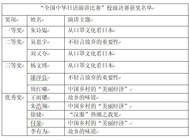 在评委老师,参赛选手,幕后人员的共同努力下,比赛圆满结束。最终朱诗韫同学获得一等奖,吴思宇,刘乂夺同学获得二等奖,杨文博,漆泽良,周红啸同学获得了三等奖,希望外语学部日语专业的同学们再接再厉,成就更美好的明天,更上一层楼!