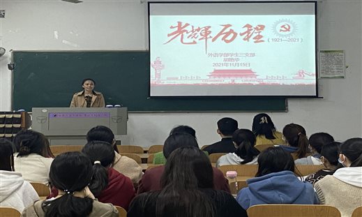 2021年11月15日晚六点,我院外语学部学生党员3支部全体成员于南3102教室线下开展了一场以“百年党史”为主题的党课学习活动。其中,我院外语学部主任胡艳华老师作为本次党课的主讲人,以严谨而又风趣的讲授风格,带领大家全面回顾了自党成立一百周年以来所经历的光辉岁月。