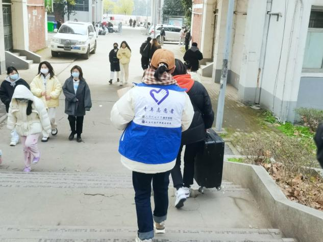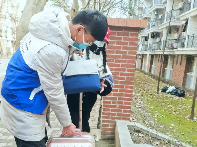 宿舍楼下,志愿者们接过同学们沉重的行李,通过平凡的一双手减轻同学返校路途中的疲惫,温暖大家的心灵。