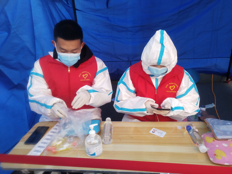 “北方的冬天三九四九是最寒冷的时候,我记得第二次筛选那天特别冷,大风有四五级,户外温度在零下10摄氏度左右,朝阳社区检测点搭建的帐篷被大风刮起来了。”史晓桐回忆道。核酸检测是用手机录入信息,防疫要求戴医用手套、喷手消毒(消毒水喷在手套的外面),手套里面就特别冷,有种要结冰的感觉,但朝阳小区的阿姨自发带来了暖水瓶,给她们这些志愿者带来了温暖,也支撑着他们坚持下去。