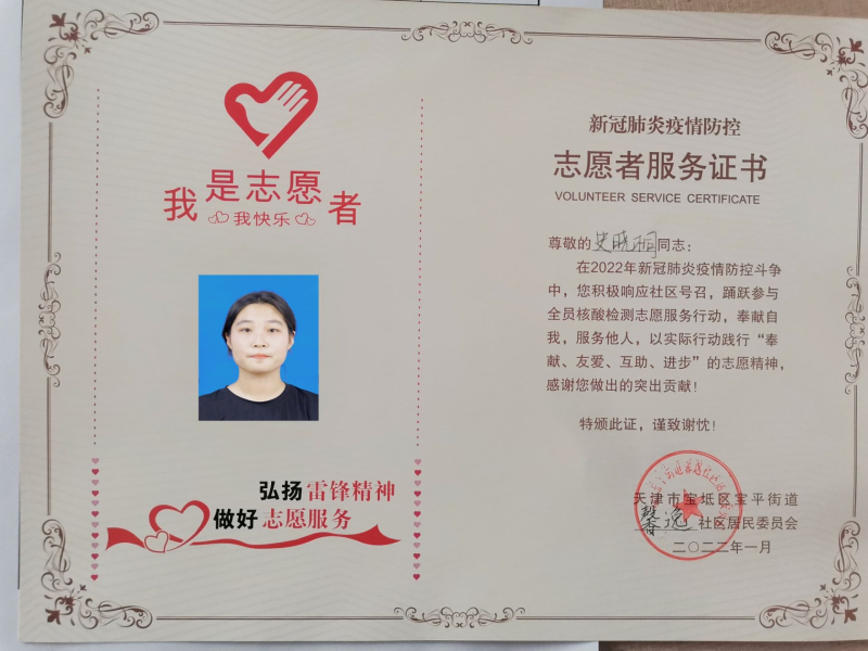 寒假期间,天津疫情爆发,宝坻区一家亲青年志愿服务社积极开展疫情防控志愿服务工作,协助核酸检测。据不完全统计,截至目前累计组织1419人、4580余人次核酸筛查、“敲门行动”等志愿服务活动,史晓桐积极参与,是宝坻区一家亲青年志愿服务社骨干成员。