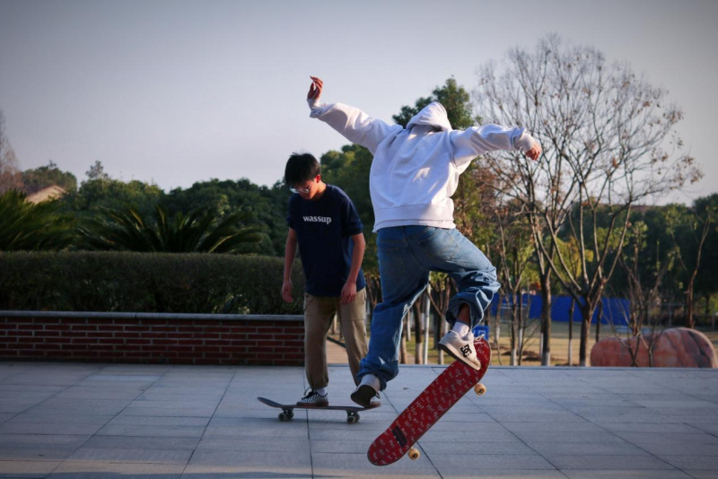 此刻,滑板男孩们在南七教学楼前的广场上“飞翔”,拥有多年飞翔经验的老将——小鸟也忍不住停下欣赏。