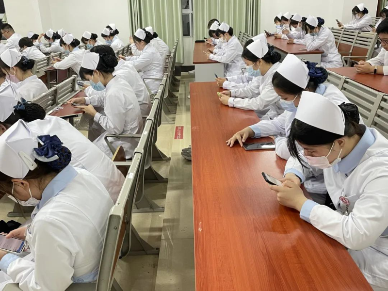 竞赛安排井然有序,选手沉着冷静,严格按照操作标准有条不紊地完成每项操作,评委客观公正。竞赛包括理论知识考试和实践操作考试两部分。理论知识考试采用学习通线上考试方式进行,考试范围为病理学、人体结构与功能、护理学导论。赛场上,选手们个个精神抖擞,认真答题,流畅、准确、细致地完成每一道题,赛场内氛围紧张而又严肃。
