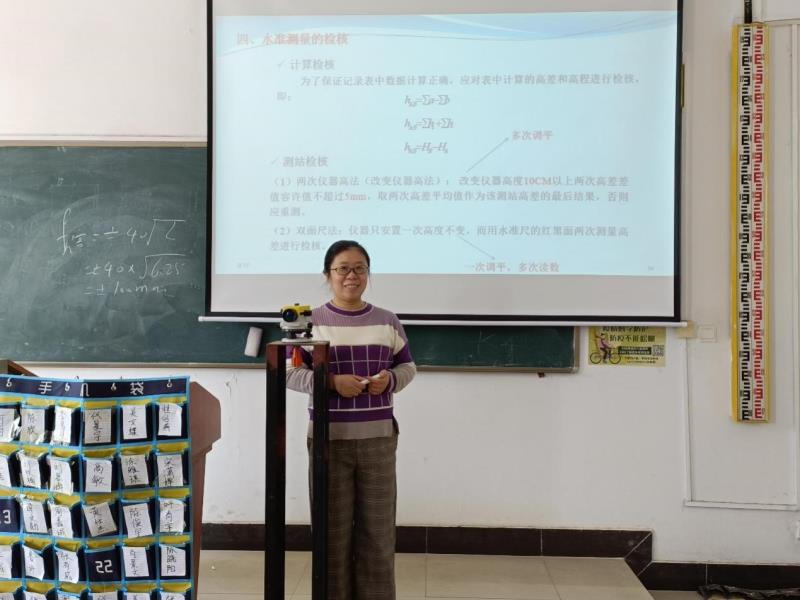 赵跃萍主讲《工程测量》《建筑材料》《道路勘测设计》等专业课程。其中《工程测量》是土木、工造、工管等专业核心课程,在选修的高等数学和计算机辅助设计等课程基础上,进一步研究工程测量的基本知识、基本理论及对工程要素(角度、距离和高差)进行测定和测设的基本方法,并掌握基本测量数据的处理方法。该课程旨在培养、训练学生工程测量常规仪器的原理、使用方法及仪器的检验、校正维护的基本知识,能较好地掌握工程测量的基本知识和实际操作技能,培养学生认真负责的工作态度和严谨细致的工作作风。