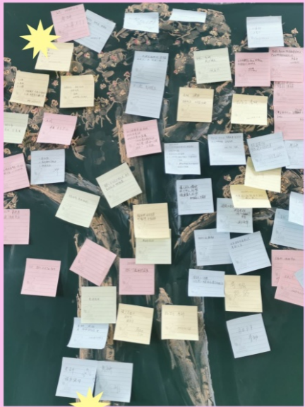 第四个环节是“未来可期”。在看完以上分享之后,大一的学生们感慨万千,展开了激烈的讨论。他们不再懵懂、不再迷茫,在3名教师的组织下,所有大一学生积极并郑重地写下了自己的心愿贴,贴在了心愿树上,仿佛树上等待成熟的果。最好的期待是未来可期。