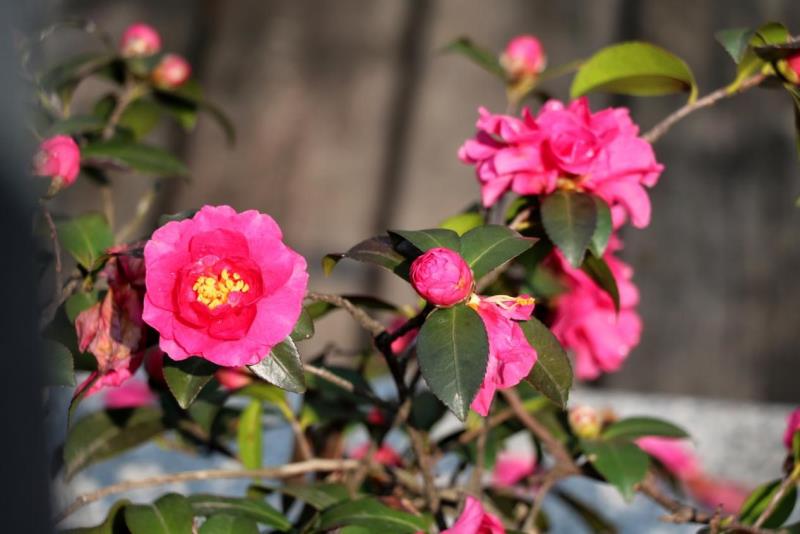 小路旁,一簇簇茶梅开得正艳,明艳的花朵在枝头盛放,花瓣层层叠叠簇拥着黄色的花蕊,在碧绿叶片的映衬下,精致而热烈,为校园增添了一抹艳丽和生机。
