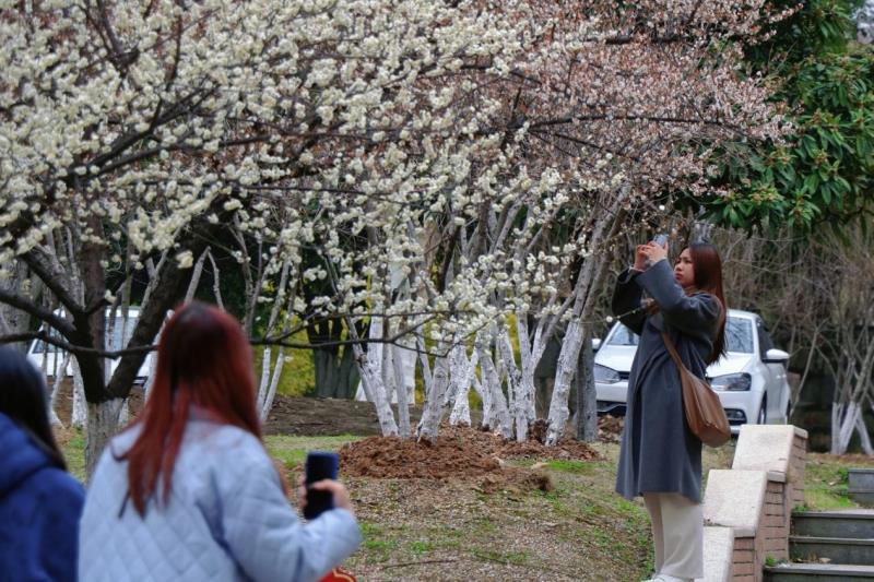 教学楼前,梅花灿若云霞,成片绽放。白色、淡粉色挂满枝头,一阵微风拂过,花瓣随风洒落,在地上堆叠。远远望去,好似下了一场雪,引得不少学生驻足拍照。