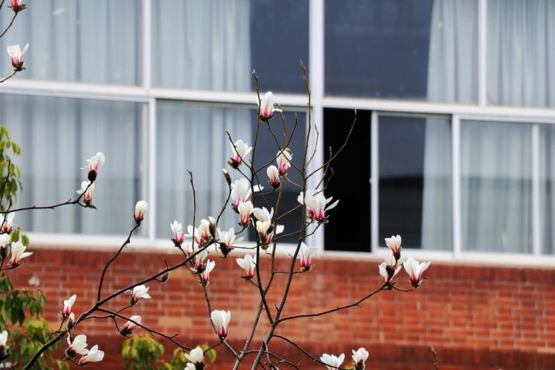 教室外,玉兰傲然花开,洁雅柔软的花瓣莹润饱满,一朵朵迎面向上伸展着婀娜的腰肢,散发出阵阵清香。从树丛中的小路走过,与春日来一场浪漫的邂逅。
