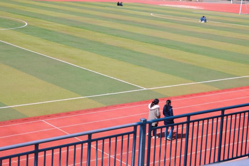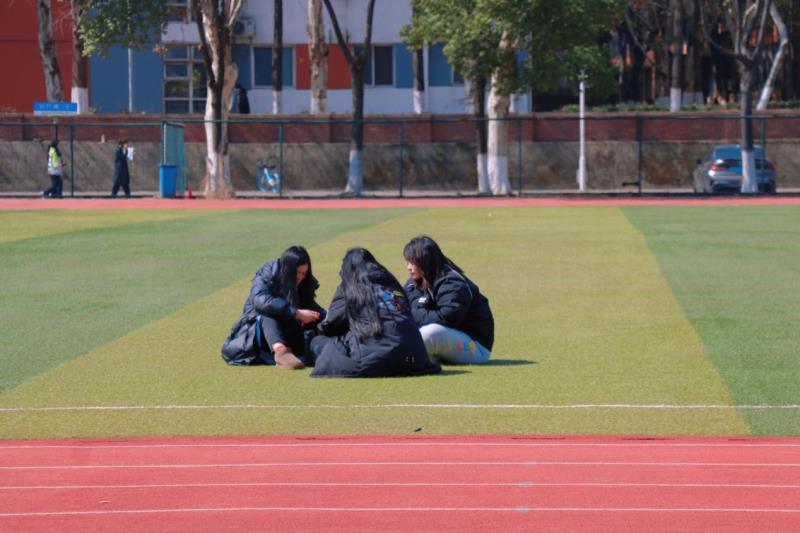 运动场上,随处可见前来沐浴阳光的学子,他们有的或坐或躺在足球场上聊天,有的在塑胶跑道上悠闲漫步,有的在篮球场上活动筋骨......鲜艳的五星红旗高高挂在旗杆上,在蓝天的映衬和春风的吹拂下,一切都显得这么静谧美好。