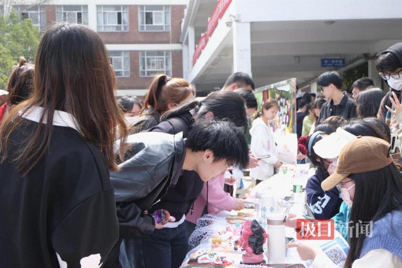 活动当天,在东湖校区南一教学楼的广场上,各个摊位有序排开,商品整齐摆放,种类丰富多彩,琳琅满目,让人眼花缭乱,吸引了众多学生驻足观看购买。摊主们热情向前来选购的学生介绍自己的创意产品和成果,买家在购买心仪的产品的同时,还与摊主们沟通交流艺术创意话题,集市气氛热烈。