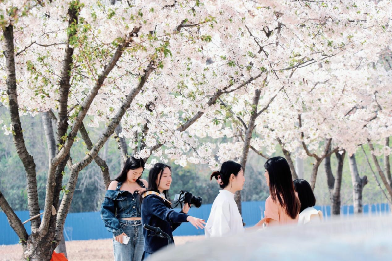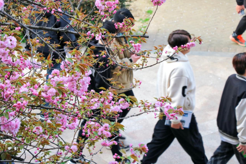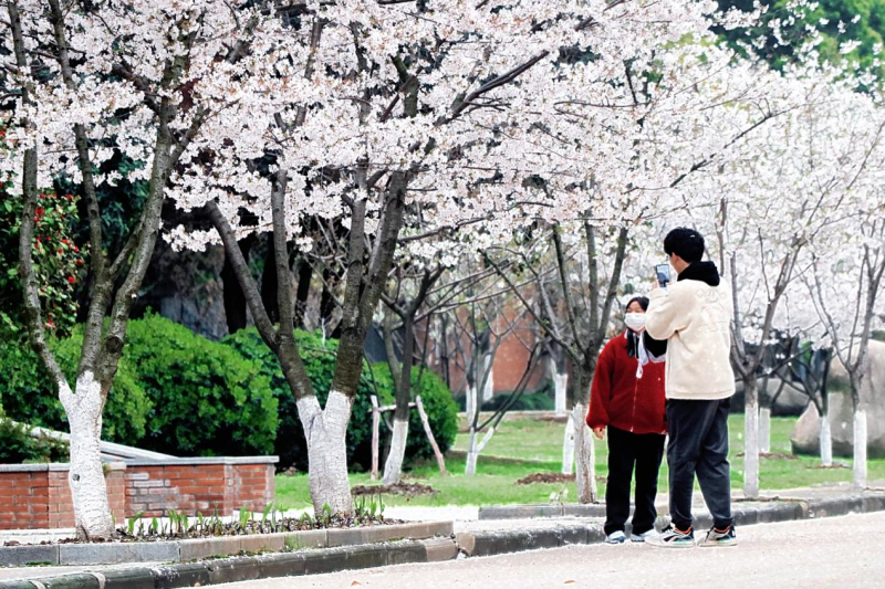 学院南区教学楼后方的樱花路,两侧近百株樱花一字排开,在暖阳里争相怒放,如云似霞,满树灿烂。师生以及附近的居民纷纷前来欣赏美景,拍照留念,感受春天的气息。