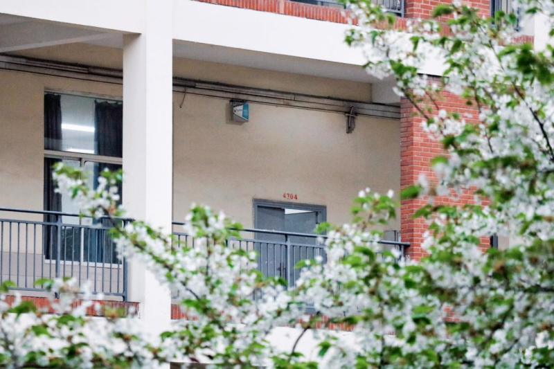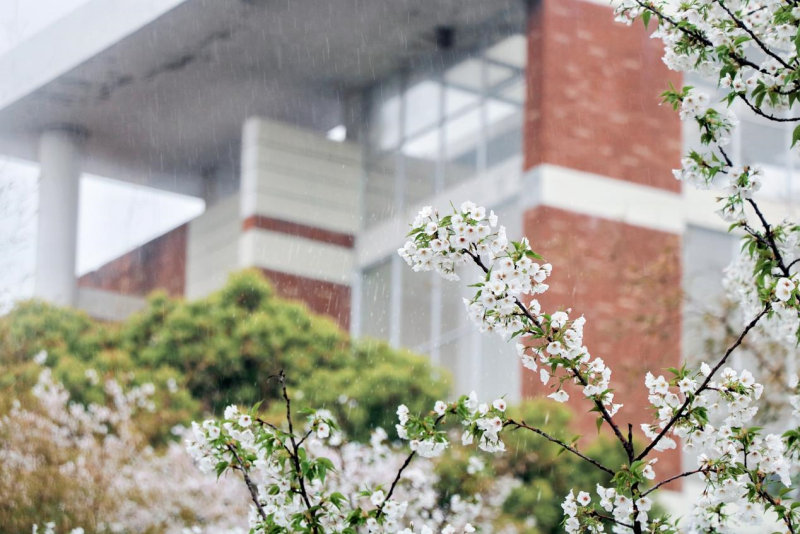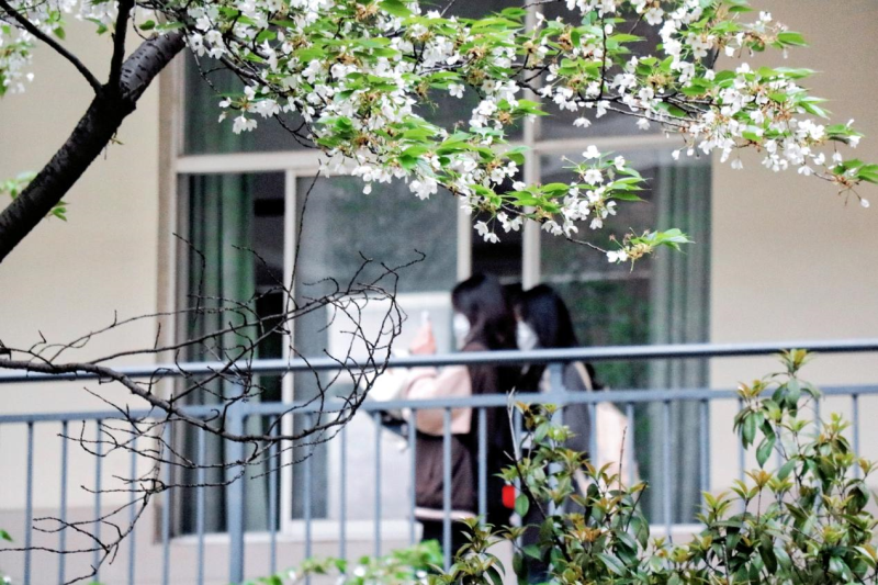 在南四和南五教学楼间,白色的樱花也争奇斗艳,教室被樱花簇拥着,与学生隔窗相望。窗内书声琅琅,窗外樱花盛放。阵阵微风拂过,瞬间飘起樱花雨,白色的花瓣洋洋洒洒,飘落满地,似霜若雪,引得人们一阵阵惊呼。