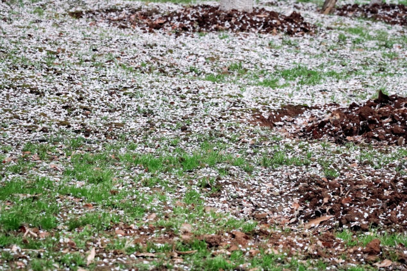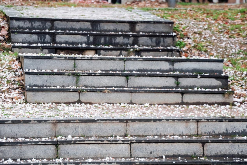 雨打樱花,花衬雨,雨中樱花尽显芳华。春分前后,阴雨连绵,淅淅沥沥的春雨打在粉嫩的花瓣上,晶莹剔透,纷纷叠叠。花瓣随微风细雨轻盈飘落,远远望去,好似给草坪、台阶、青石板路铺了一张粉嫩的“樱花地毯”,别有一番浪漫。