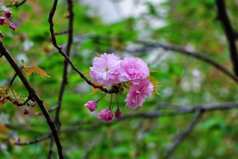 三月接近尾声,淡雅清纯的早樱已绚烂数日,开始大规模飘落,宛若飞雪,这时,藏匿在其中的晚樱悄然绽放。相比于早樱,晚樱颜色更艳丽、花型更饱满,远似绣球,近若薄绢,优雅动人。漫步其中,好似置身于粉色的童话世界之中。