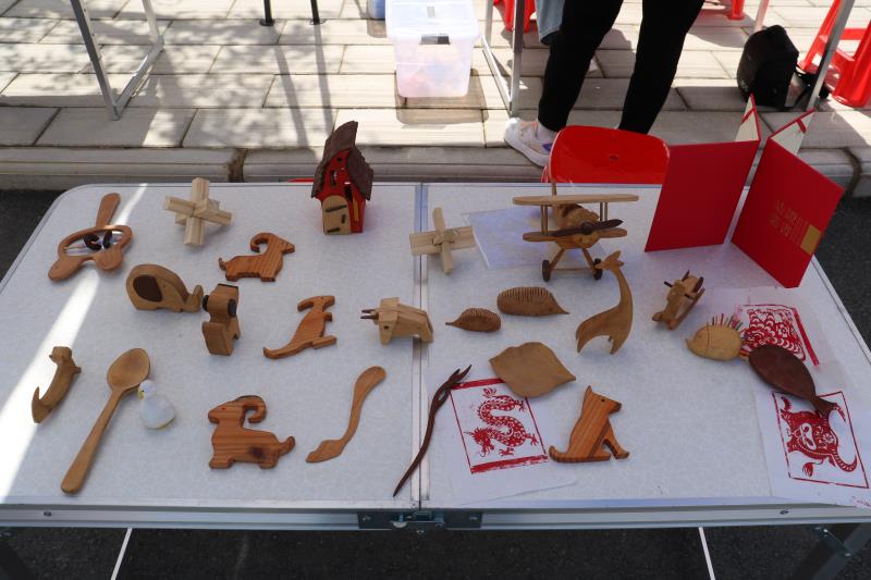 当日上午7时40分,招新人员开始布置现场。上午8时,招新活动开始,在招新地前的小桌子上,摆满了老师和非遗文化创意工作室成员们的优秀木艺作品,旁边的小桌子上还摆放了一些材料,供学生们体验制作木艺品时饮用。从上午8时到下午6时,前来尝试制作木艺作品学生不间断,招新现场热闹非凡。