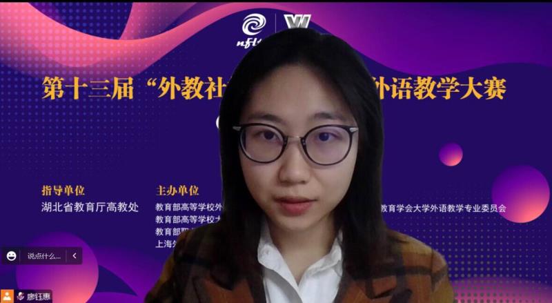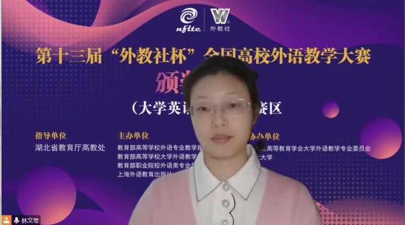 “外教社杯”全国高校外语教学大赛从2010年举办至今,在我国高校外语教学界影响面甚广,已列入全国高校教师教学竞赛统计数据榜单。自6月份湖北赛区赛事启动以来,经过初赛和复赛层层选拔,每组各16名教师进入决赛。在11月6日的决赛中,我校外语学部教师廖钰惠、林文琴凭借扎实的语言基本功、有效的教学方法、新颖的课堂设计和优秀的临场应变能力,在湖北赛区决赛中脱颖而出,分别获得视听说组一等奖、综合组二等奖。