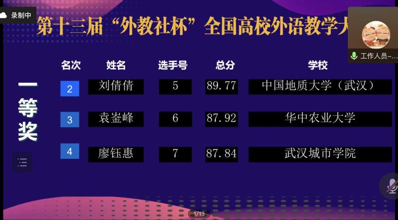 此次两位教师的获奖将外语学部教师在该赛事湖北赛区获奖的记录刷新到连续13年,是外语学部一贯坚持以赛促教、以赛促学、以赛促改,不断推动学部教学建设和师资队伍建设的又一成果。