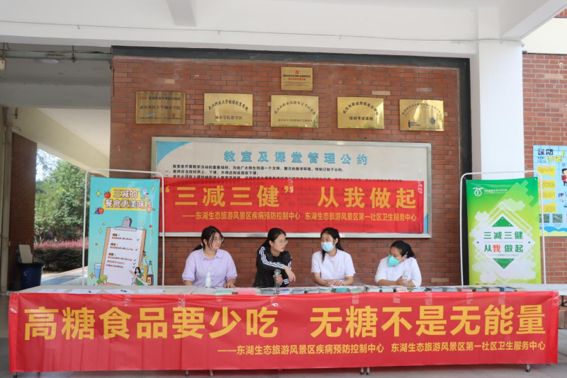“三减就是减盐、减油、减糖……大家一定要保持规律作息,健康饮食!”除了疾病防治的宣传之外,东湖风景区第一社区中心卫生服务中心医护人员还在现场进行了“三减三健”健康生活方式的倡议,引导学生们养成健康的饮食习惯,从“吃”上防治各类疾病。“这次我们回到曾经的校园进行宣传就是想以九月开学季为契机,开展减糖进校园活动,引导在校的学生少吃甜食、少摄入高糖饮料等,能够让我的学弟学妹们健康在校园内求学,也是我为母校建设做出的一份努力。”今年从我院医学部护理专业毕业的东湖风景区第一社区卫生服务中心的医护人员董辛一说。